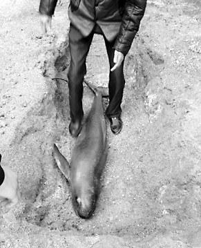 据福清市海洋与渔业法律中队郑昌烨介绍,经判定,该海豚学名为东亚江豚(列入《世界自然维护联盟》世界野生动物红皮书,2011年名录ver3.1易危),总长约150厘米,体宽约22厘米,体重约30公斤,因为福州新港码头就在江阴半岛,邻近海域为世界航道,可能是海豚误入航道被通过的轮船碰击后受伤,而被邻近渔民捞到岸上。鉴于海豚为维护动物,制止私自捕捉食用或贩卖,渔政部分与边防所同志找到邻近的老乡帮助,将该海豚就地埋葬,并奉告周围的渔民大众遇到相似状况不能私自捕捉食用或贩卖。(记者 林娟 通讯员 林莹文/图)